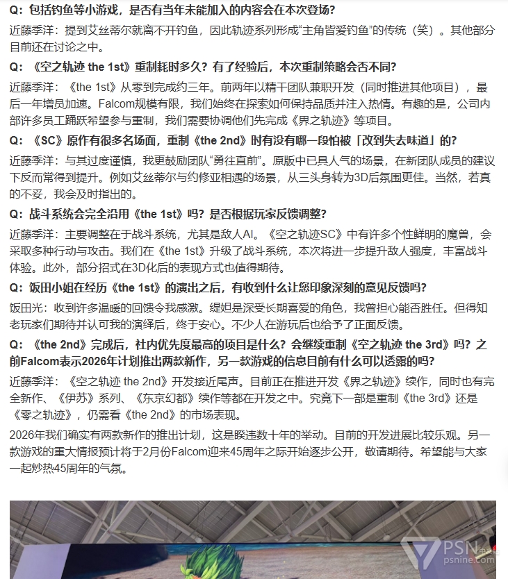 近藤季洋:《the 1st》从零到完成约三年。前两年以精干团队兼职开发(同时推进其他项目),最后一年增员加速。Falcom规模有限,我们始终在探索如何保持品质并注入热情。有趣的是,公司内部许多员工踊跃希望参与重制,我们需要协调他们先完成《界之轨迹》等项目。