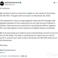 原定于2025年10月31日发售的《终结者2D:No Fate》延期至2025年11月26日发售。由于全球贸易及关税政策变动,游戏的实体首发版与典藏版的零部件运输出现了延迟。为了所有版本能在同日发售,故决...
