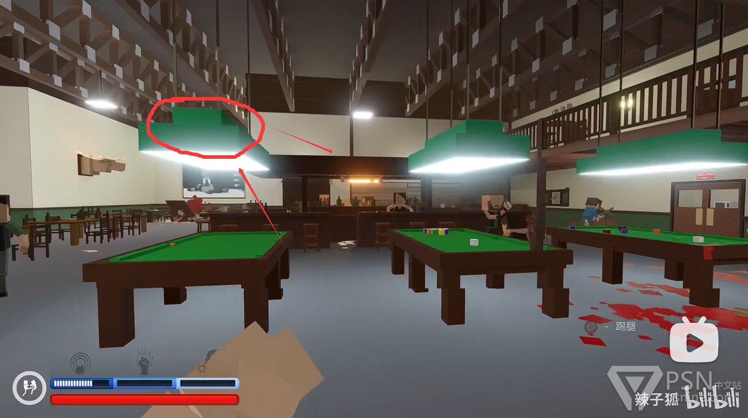 ·砍完周围的人后前往台球桌拿到台球杆往吧主办公室门丢,吸引吧主仇恨;