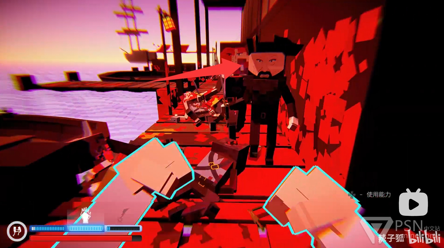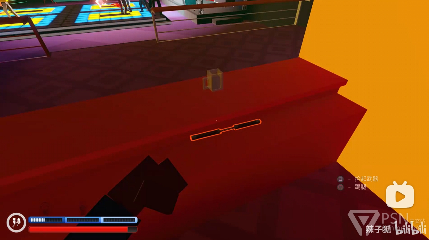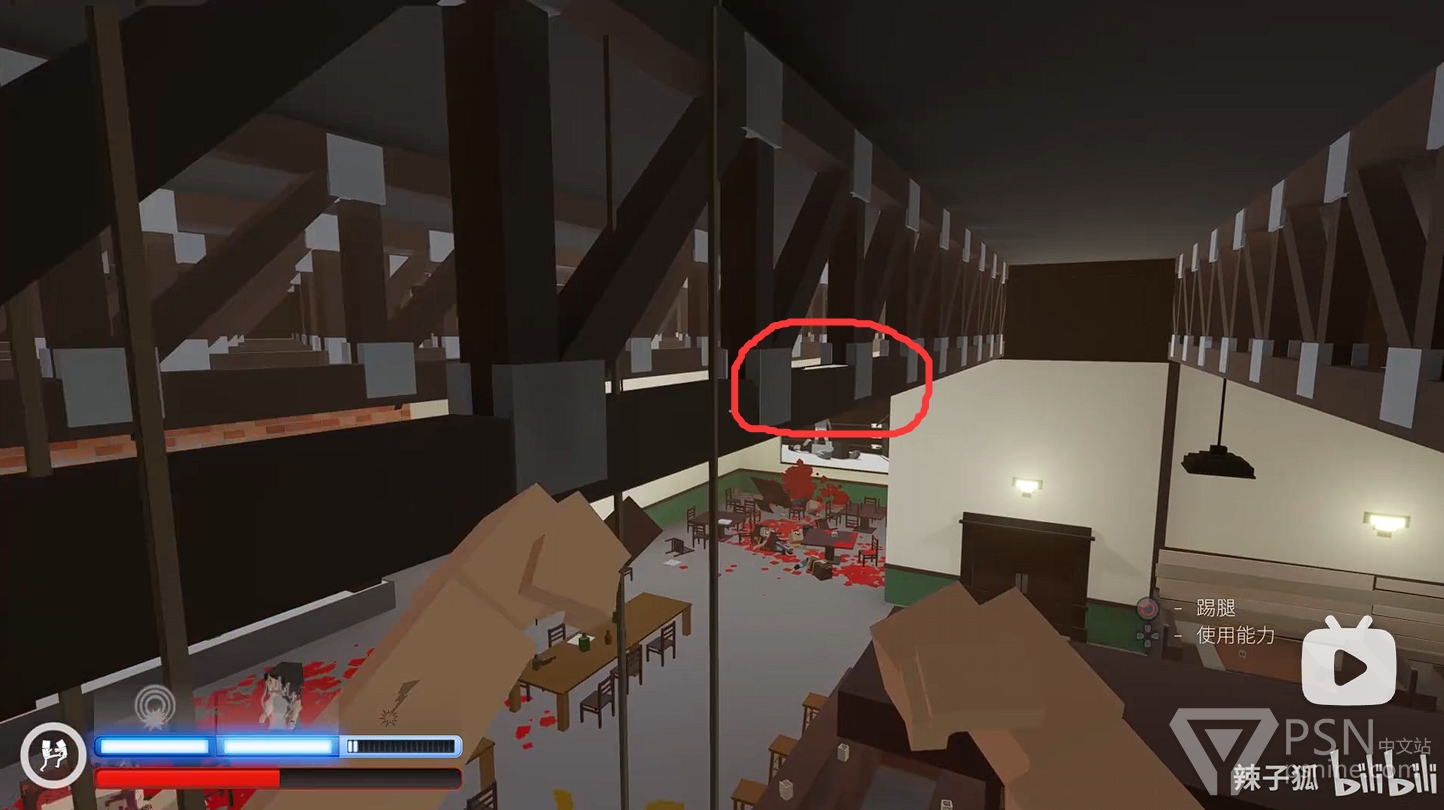 ·随后回头跳到酒吧台上方拿到水果刀,并跳到对面的二楼上击杀周围敌人;