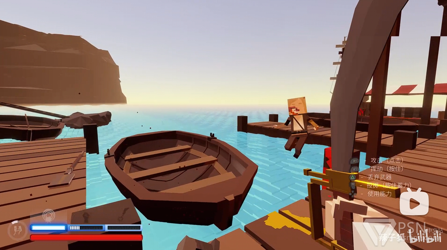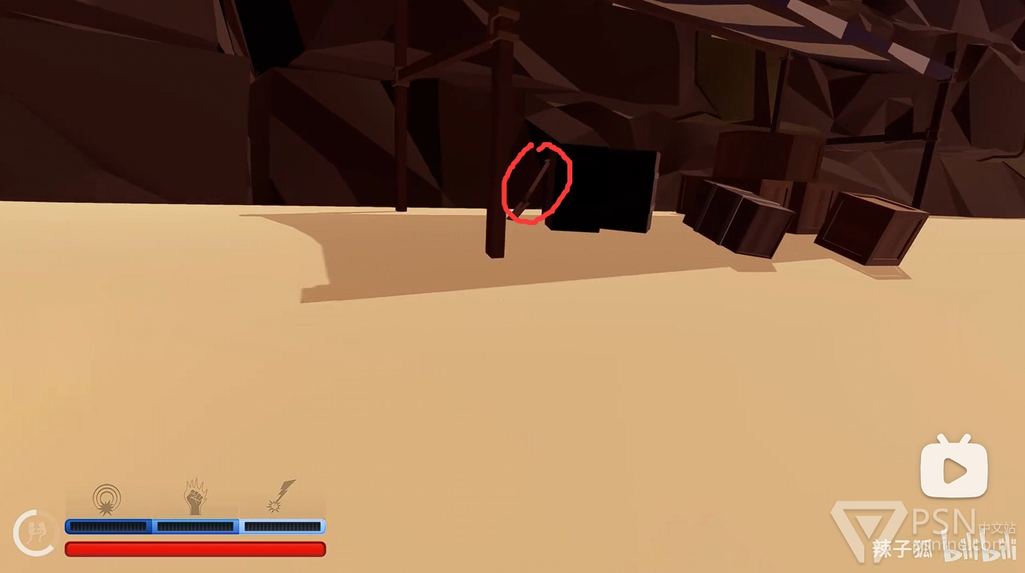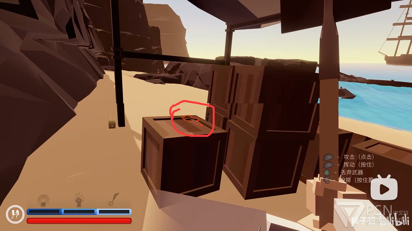 ·开局前往沙滩,在堆满木箱的地方旁有把铁铲以及一把小刀可用;