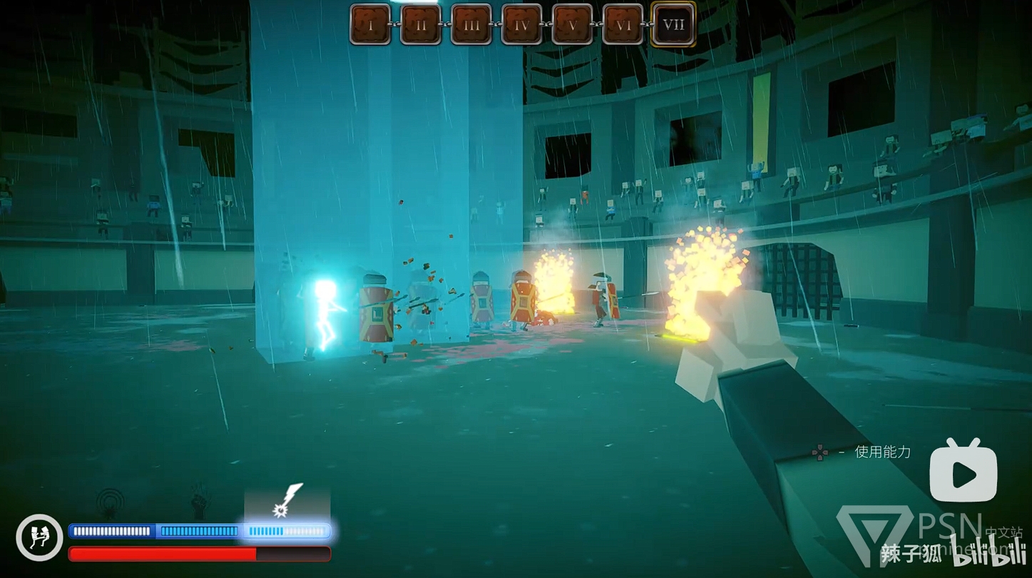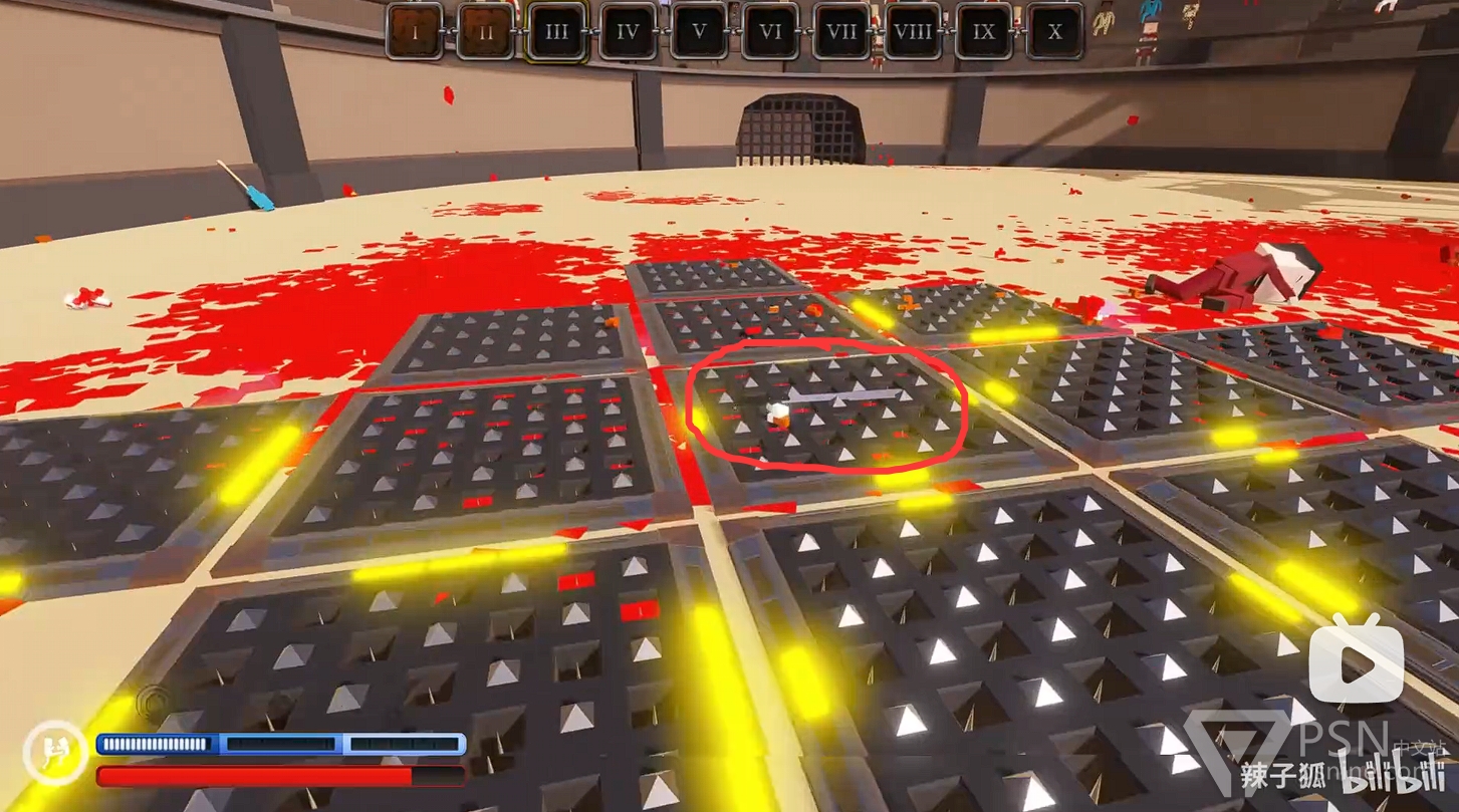 ·第六关:开局会遇到手持防爆盾的敌人,竞技场内布置有四个旋转火焰陷阱,可以跳到它上面防守即可;