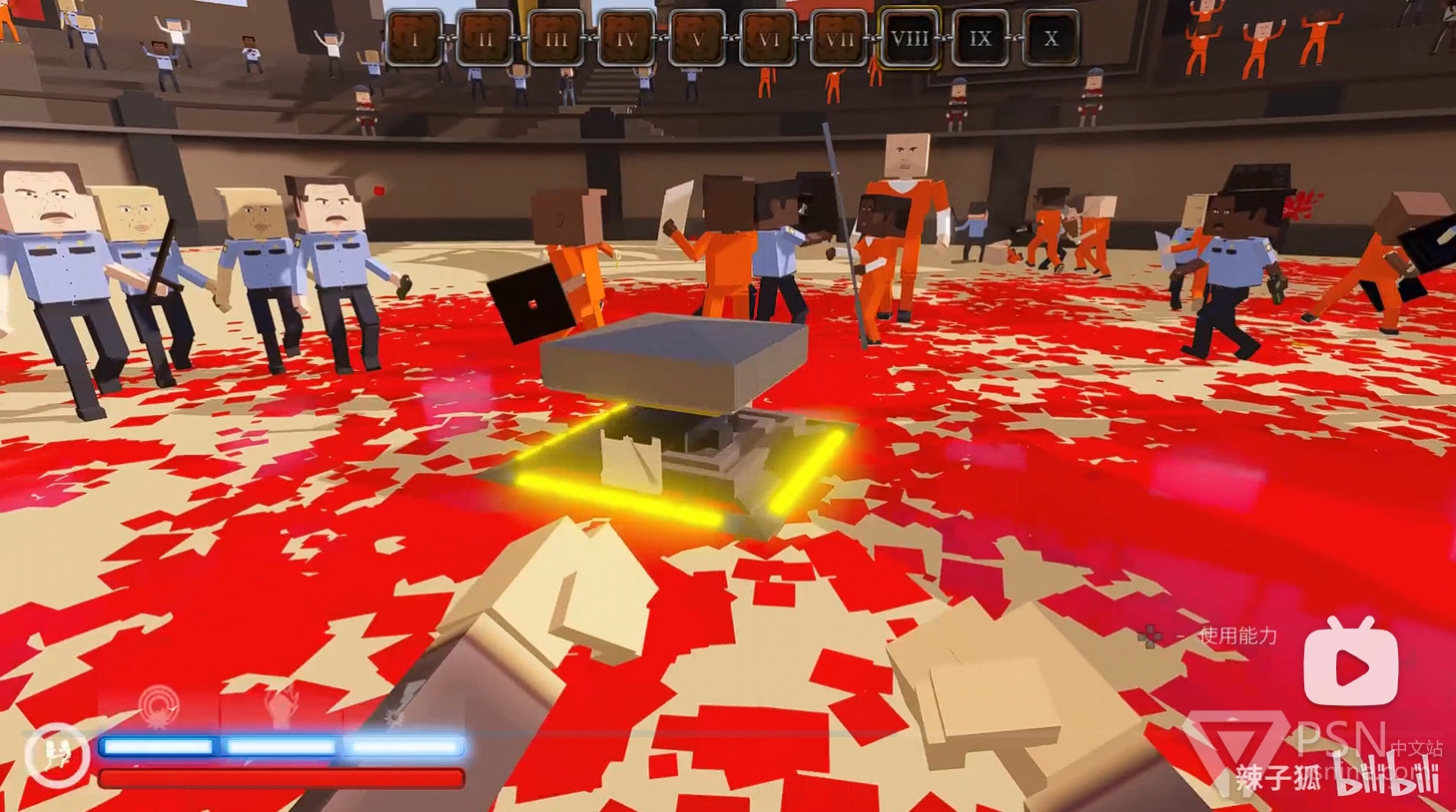 ·第八关:开局会遇到警卫队和囚犯,场中央布置有旋转刀片陷阱,可站到上面吸引敌人,通过陷阱快速击杀敌人;(24s)
