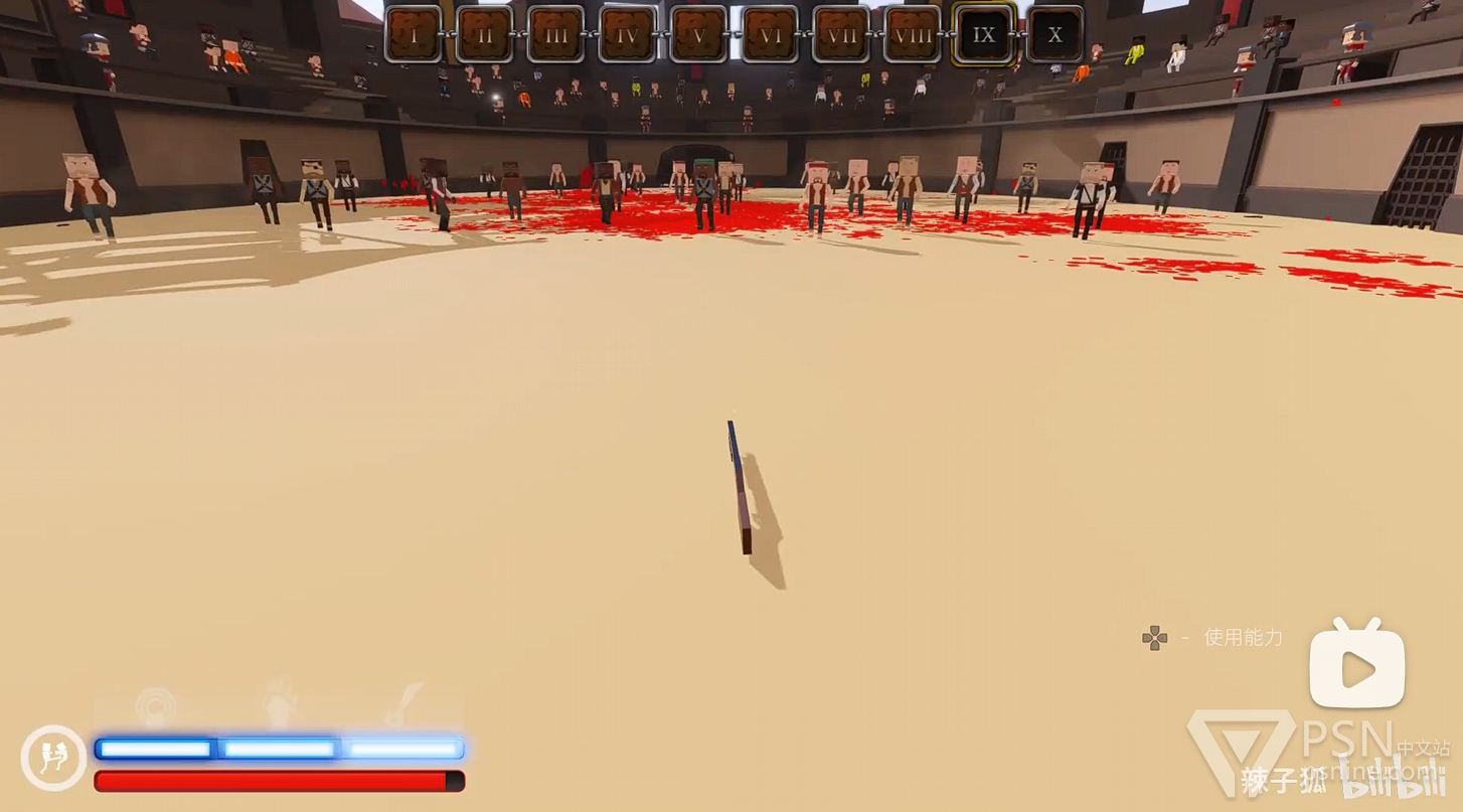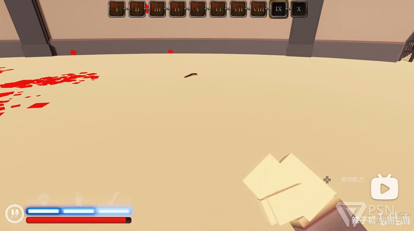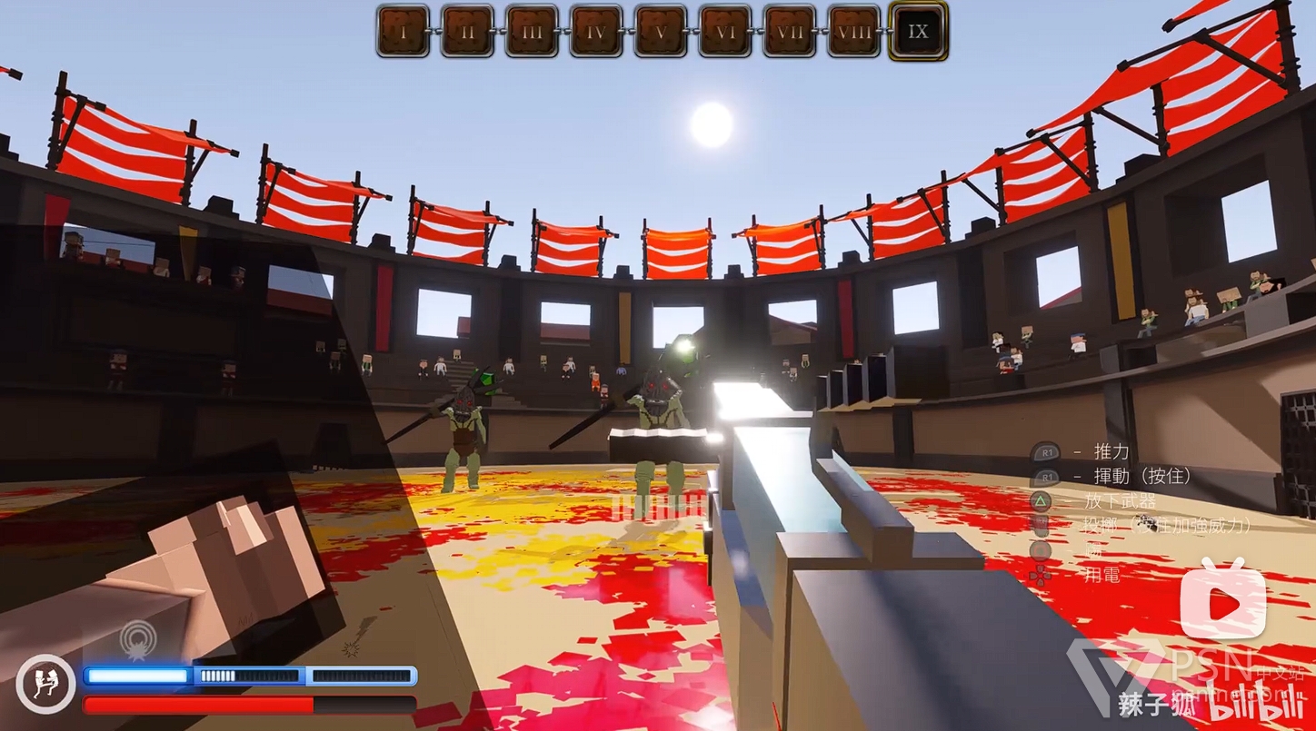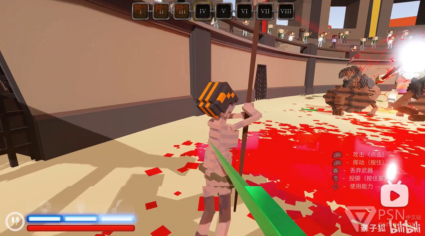 ·第一关:开局会遇到一个中世纪盾枪兵,场地中央有把短剑,捡起后从敌人侧面攻击即可;