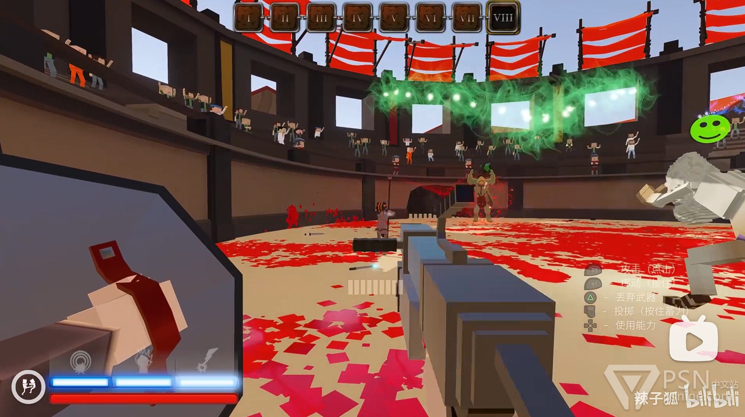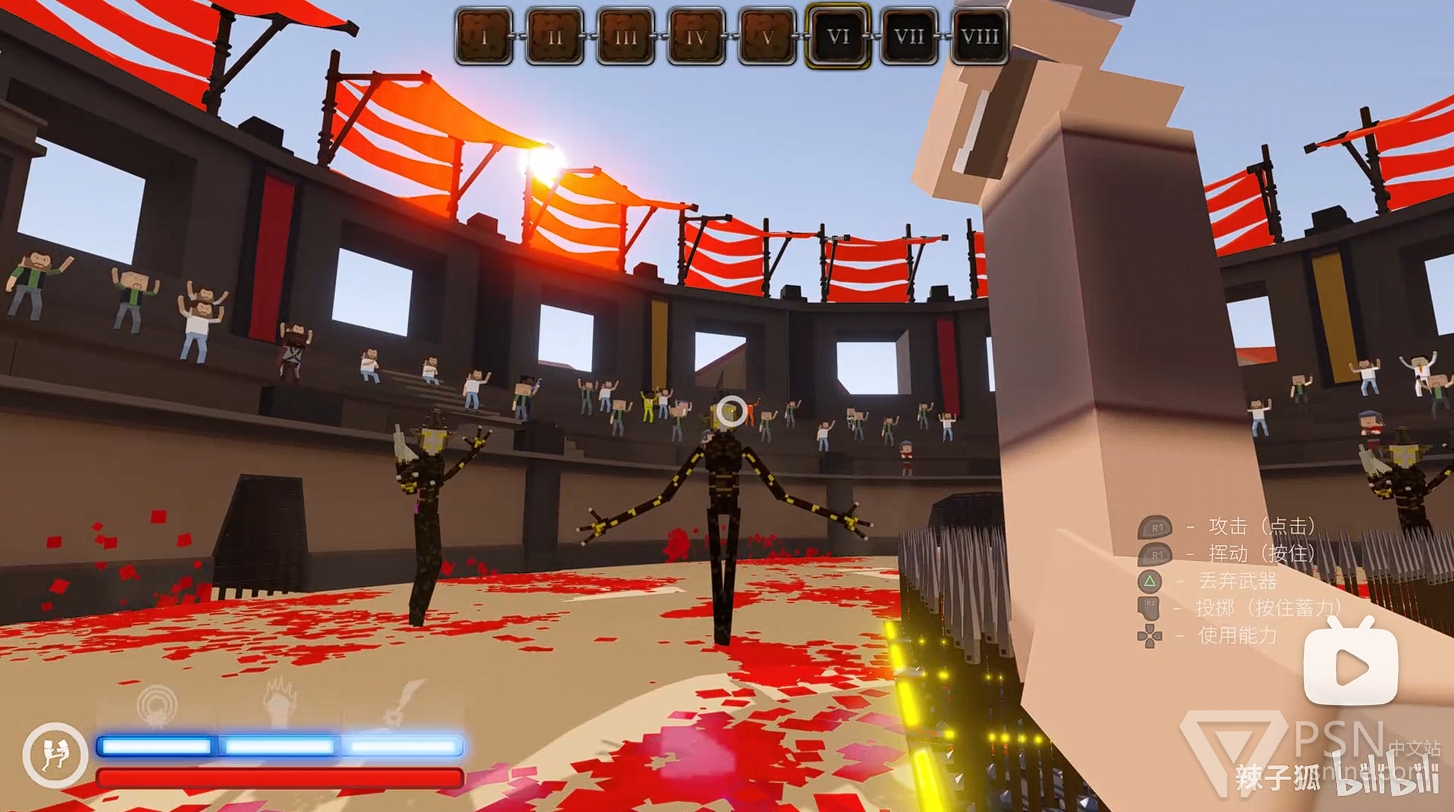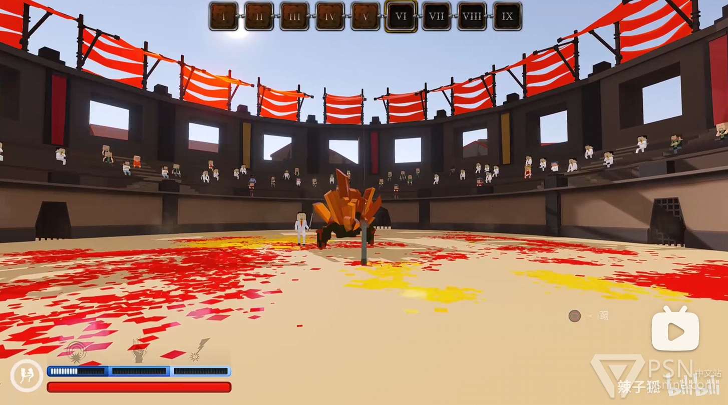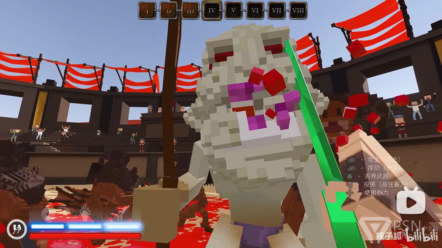 ·第一关:开局会遇到一个中世纪盾枪兵,场地中央有把短剑,捡起后从敌人侧面攻击即可;