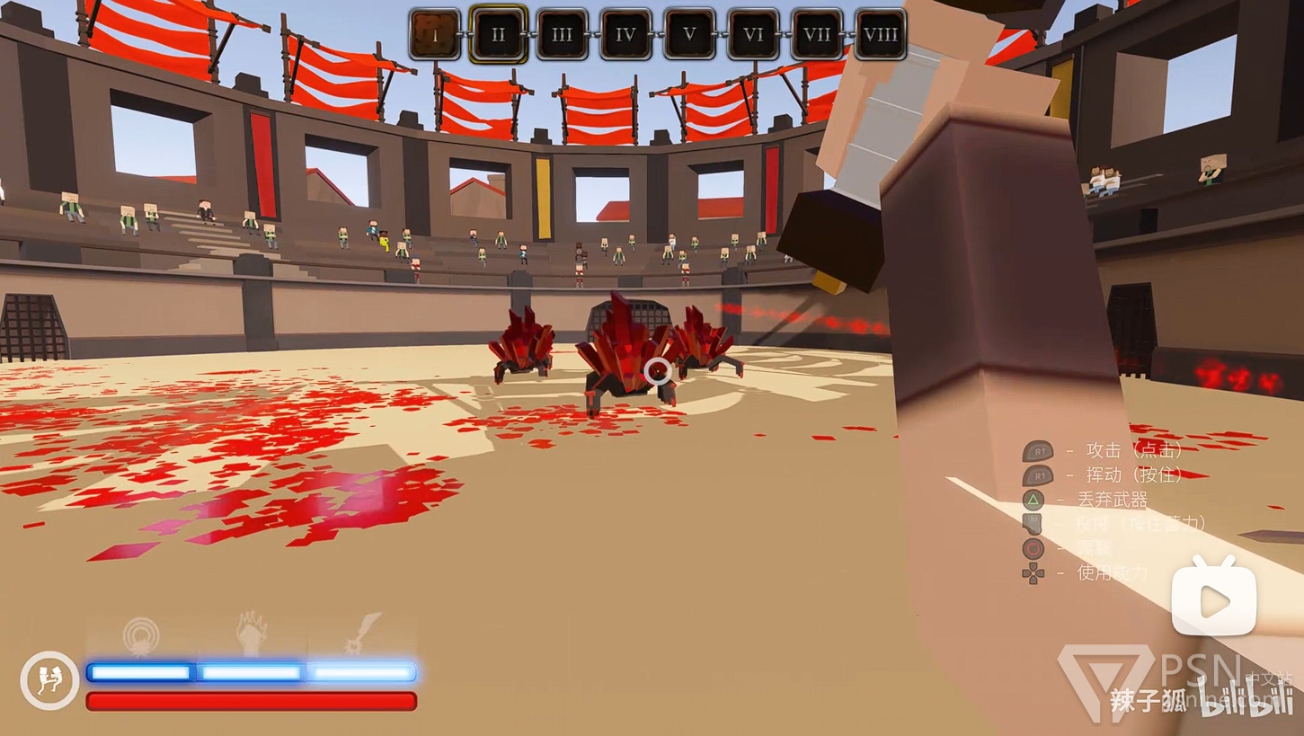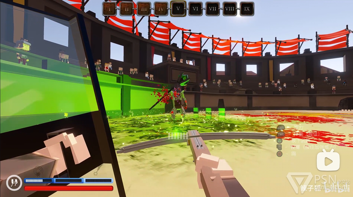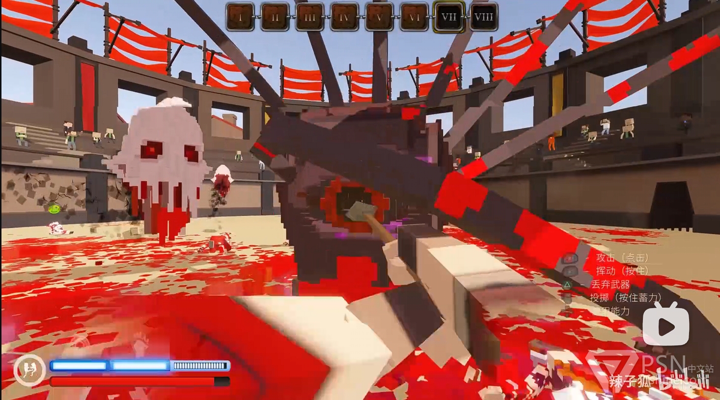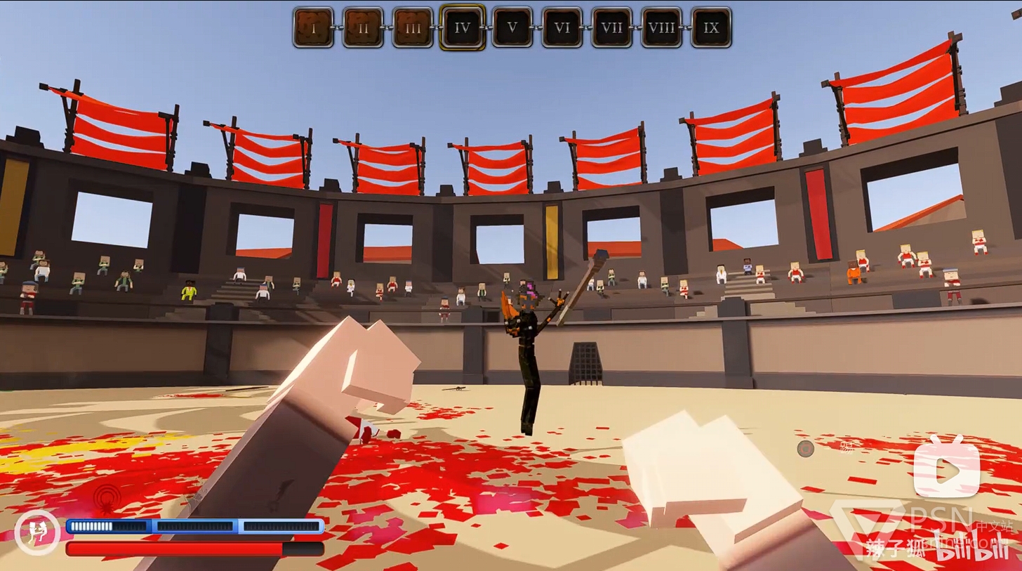 ·第一关:开局会遇到一个中世纪盾枪兵,场地中央有把短剑,捡起后从敌人侧面攻击即可;
