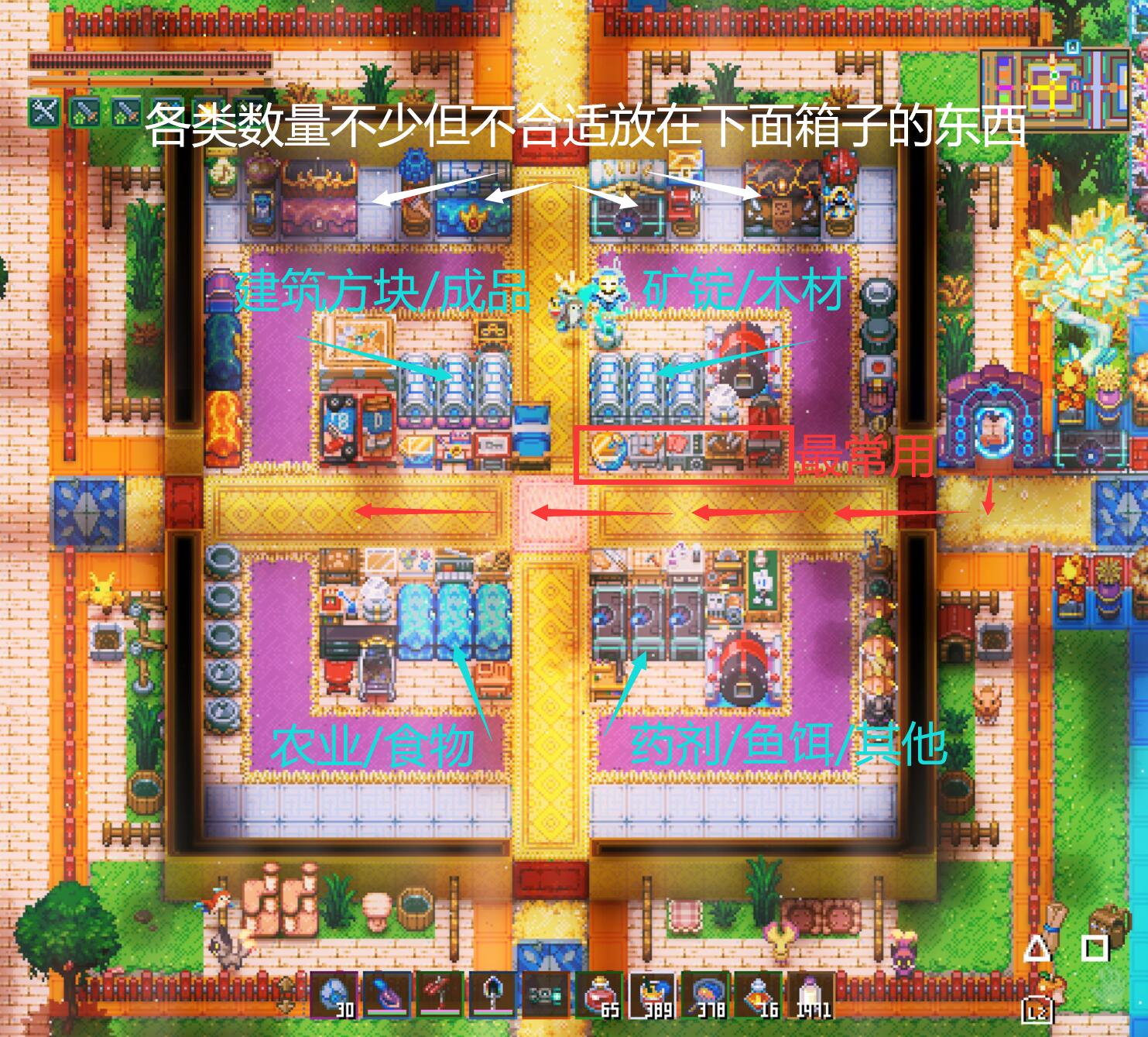 上方墙边放各种常用物品:建筑方块、挖矿配套、boss召唤物、颜料刷、各类箱子等