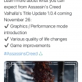 刺客信条英灵殿更新了1.04补丁,修复了很多性能和稳定方面的问题。补丁具体内容可以点击出处查看。以下是机翻:内容质量/性能模式介绍在游戏中增加了一个选项,允许玩家选择性能或视觉质量。功...