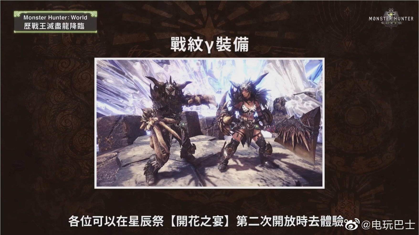 《怪物猎人:世界》DLC中迅龙回归,并新增怪物“猛牛龙”与“冰鱼龙”登场,主题怪为冰系魔物冰咒龙,具体攻击方式未公布,猎人追加了新动作。新DLC中将追加更高的“大师级”相当于以往系列中的G级任务。