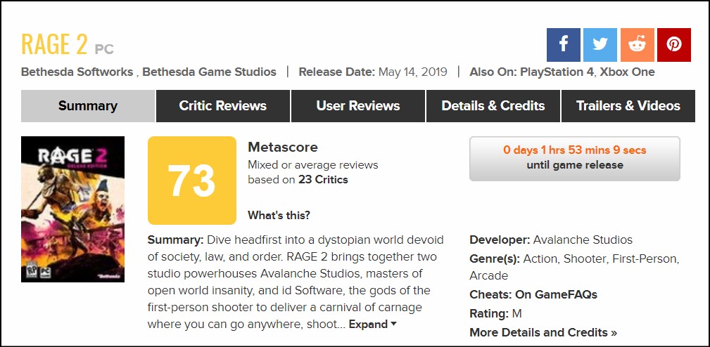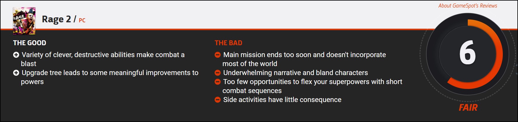 Rage2评分解禁,IGN 8 / GameSpot 6/ MetaCritic媒体均分73