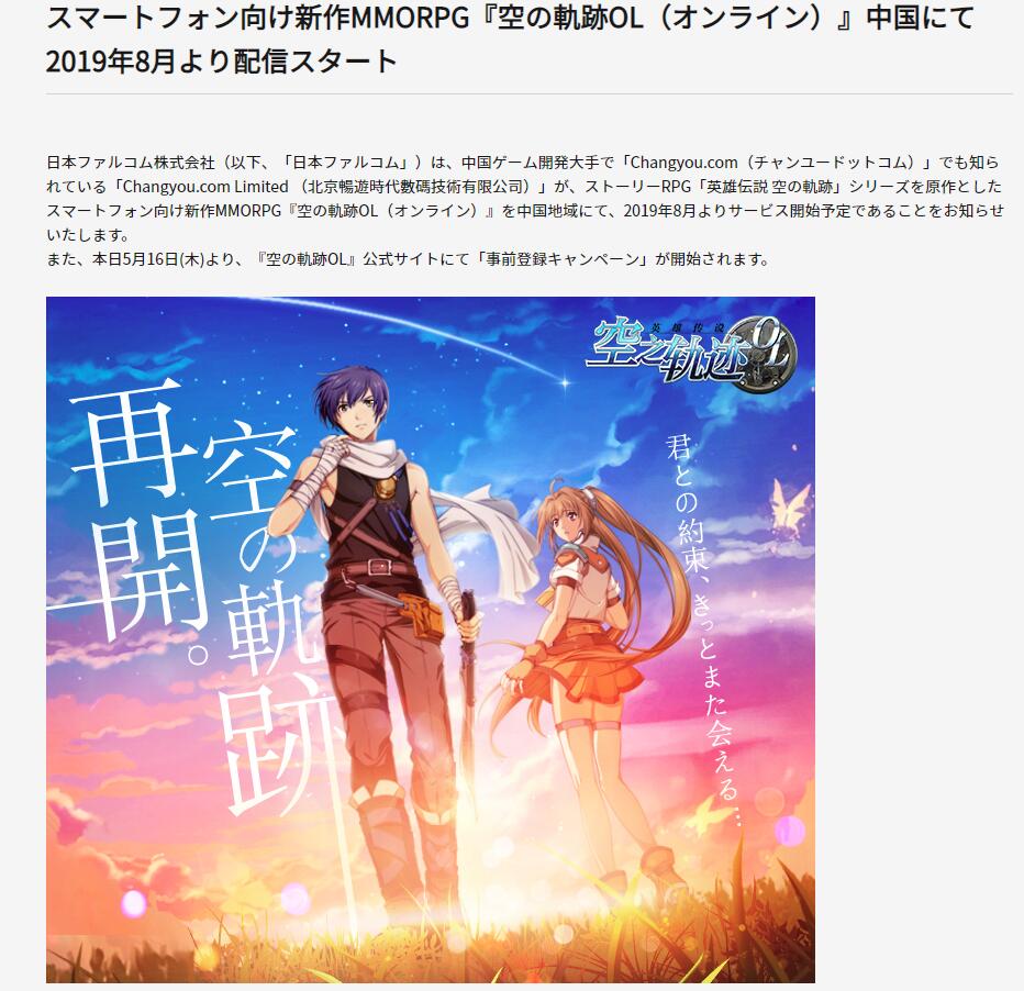 手机平台MMORPG《空之轨迹OL》将于2019年8月在中国上线,iOS版8月1日,安卓版8月8日,今日起开始事前登录活动,官网:http://kzgj-activity.changyou.com/kzgj/cover/20190503/pc/index.shtml
