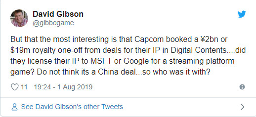 Capcom在财报中没有公开是谁支付的这笔费用,分析师Gibson推测Capcom可能是将他们的IP授权给微软或者谷歌以上架其云平台。