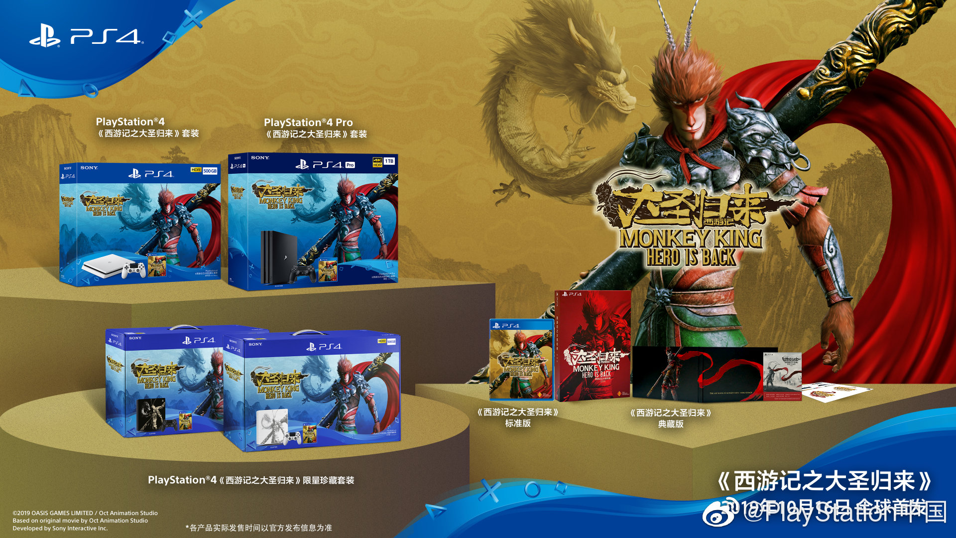 【《西游记之大圣归来》国行版发售确定!】《西游记之大圣归来》PS4游戏将于10月16日在中国大陆地区全球首发。《西游记之大圣归来》是基于中国原创电影IP由中日双方联合开发的PS4主机游戏,以独特的画风和扎实的动作游戏元素,受到全球玩家和媒体好评。玩家可以通过PS4高度的沉浸感,在电视屏幕上亲自操作大圣进行战斗,还可体验到电影中未曾讲述的故事。(* 各产品具体上市时间以官方发布信息为准)