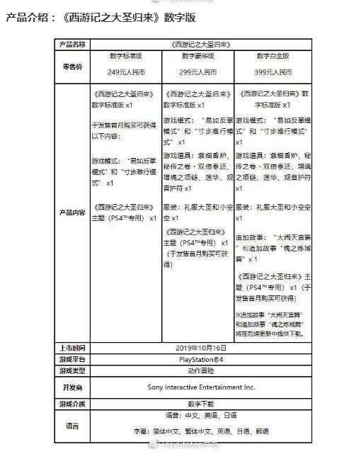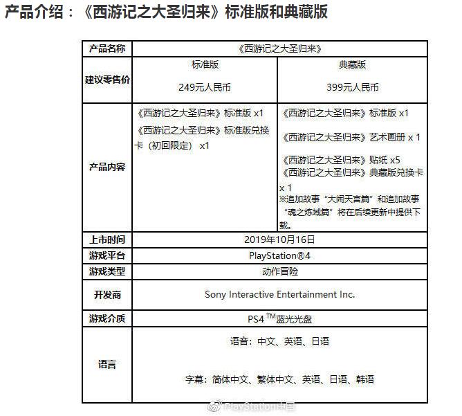 【《西游记之大圣归来》国行版售价确定!】索尼互动娱乐公司(上海)有限公司和上海东方明珠索乐文化发展有限公司今日宣布,将于2019年10月16日在中国大陆市场全球首发PlayStation4简体中文游戏《西游记之大圣归来》,“标准版”和“典藏版”建议零售价分别为249元人民币和399元人民币。PlayStation4《西游记之大圣归来》套装、PlayStation4《西游记之大圣归来》限量珍藏套装和PlayStation4 Pro《西游记之大圣归来》套装将同步发售,建议零售价分别为2,149元人民币、2,199元人民币和2,949元人民币。