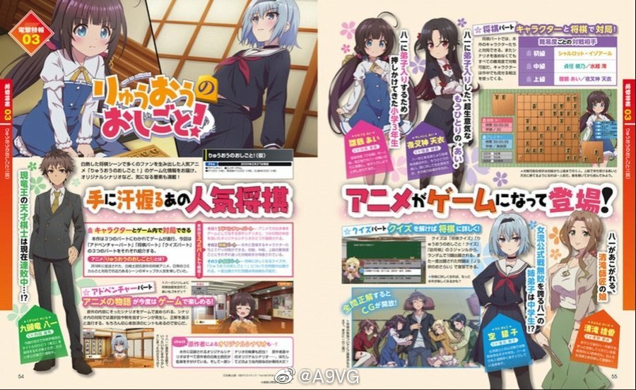据速报消息,以将棋为题材的轻小说/动漫《龙王的工作》将改编为游戏登陆PS4/Switch平台,预定于2020年2月27日发售。游戏将包含ADV、将棋、猜谜三个部分。