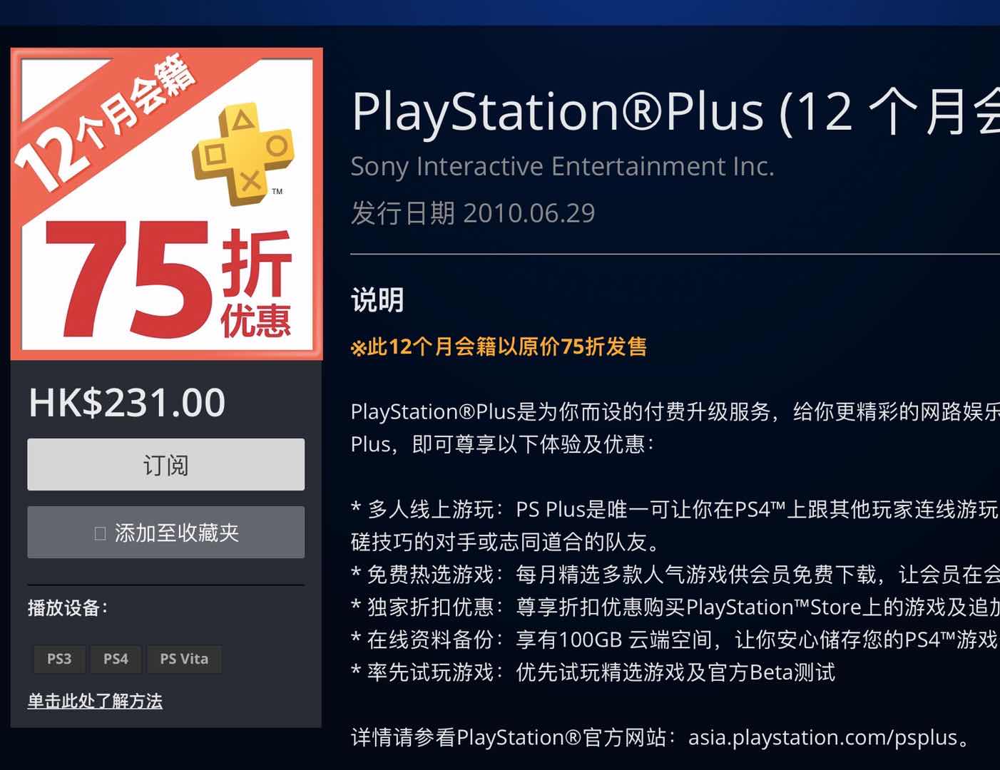港服psn会员七五折啦。