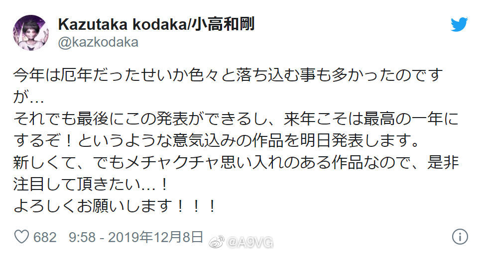 小高和刚表示明天(12.9)会发表新作