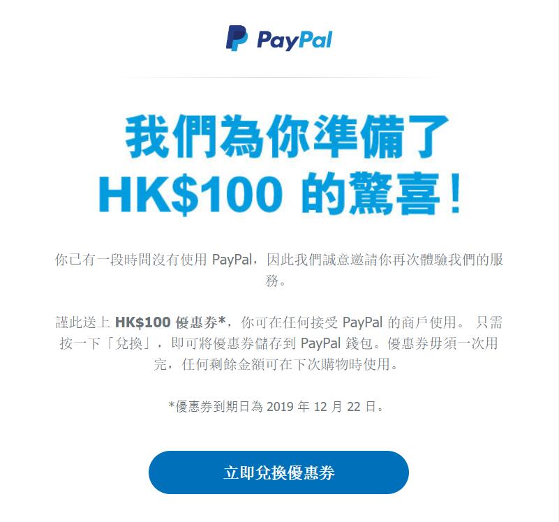 上次在机因看到有人收到paypal送的优惠券结果就跑去注册了一个账号,这次竟然真的收到了100港币