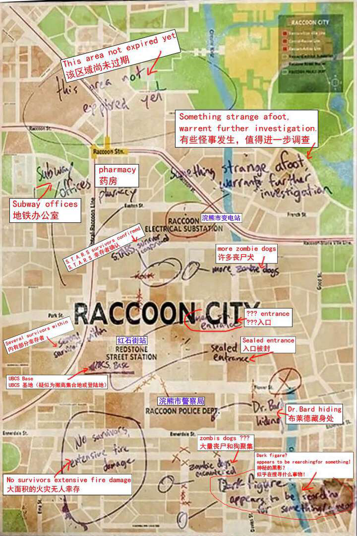 有人把《生化危机3》限定版附送的浣熊市地图,就是上面有一堆吉尔的笔记标注的那个,提取出来做了个简单的翻译。