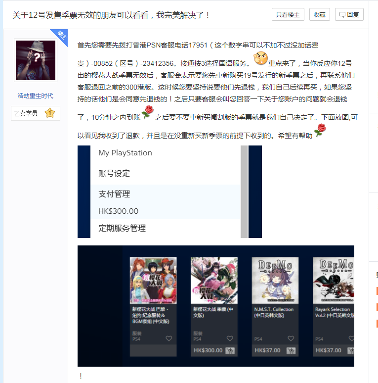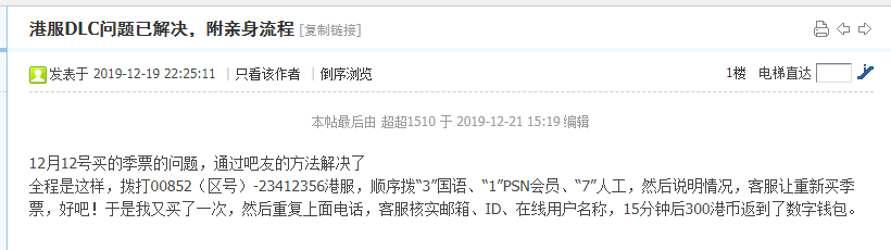 以下是电话反馈成功的例子,港版PSN客服上班时间是周一~周六 上午10~晚上19点
