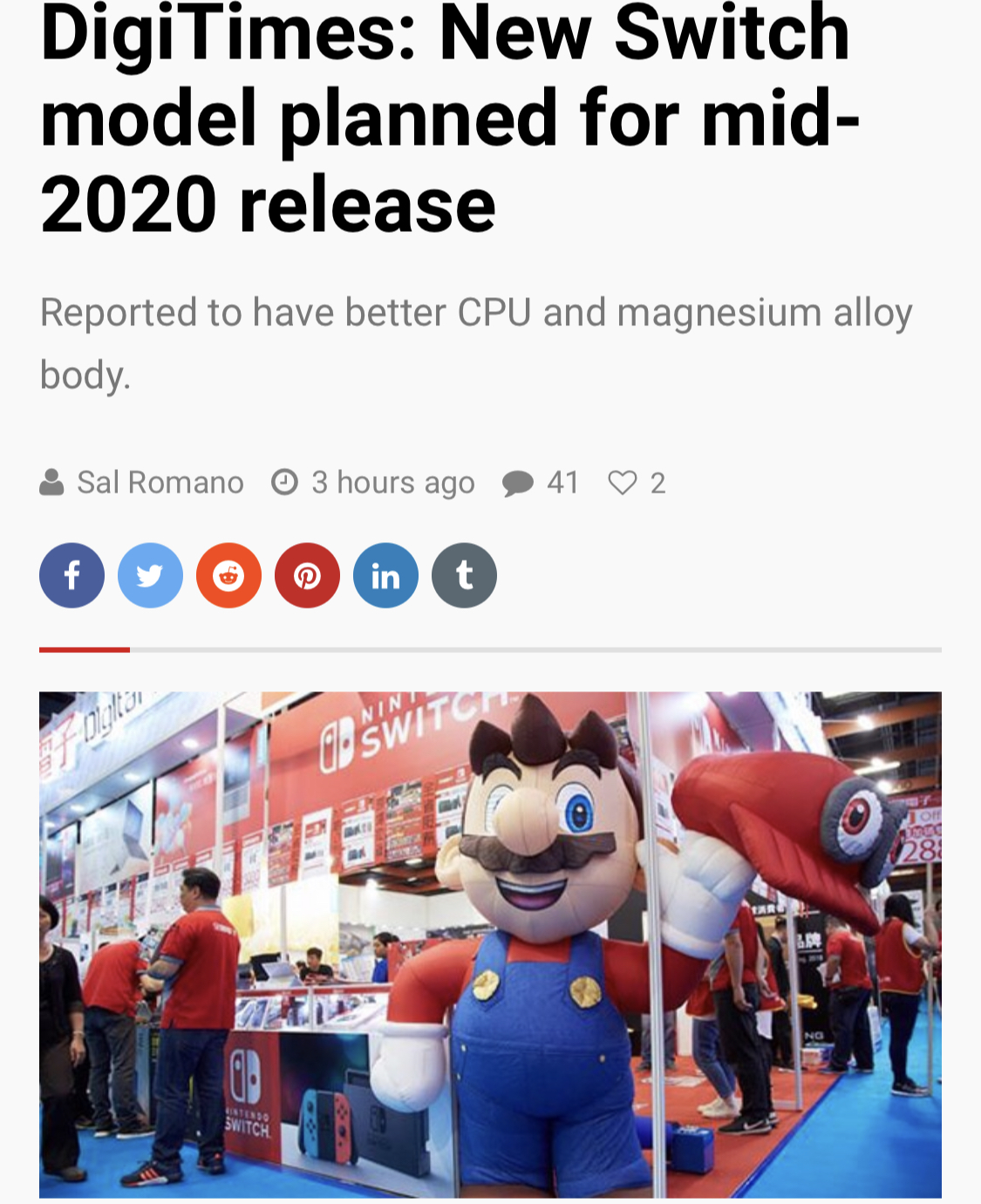 根据 DigiTimes 援引相关上游供应链的消息称:任天堂将在2020年年中推出一款新型号Switch。预计将在2020年第一季度末开始进入量产。 新型号Switch将拥有更好的CPU和镁合金机身,而不是塑料机身。