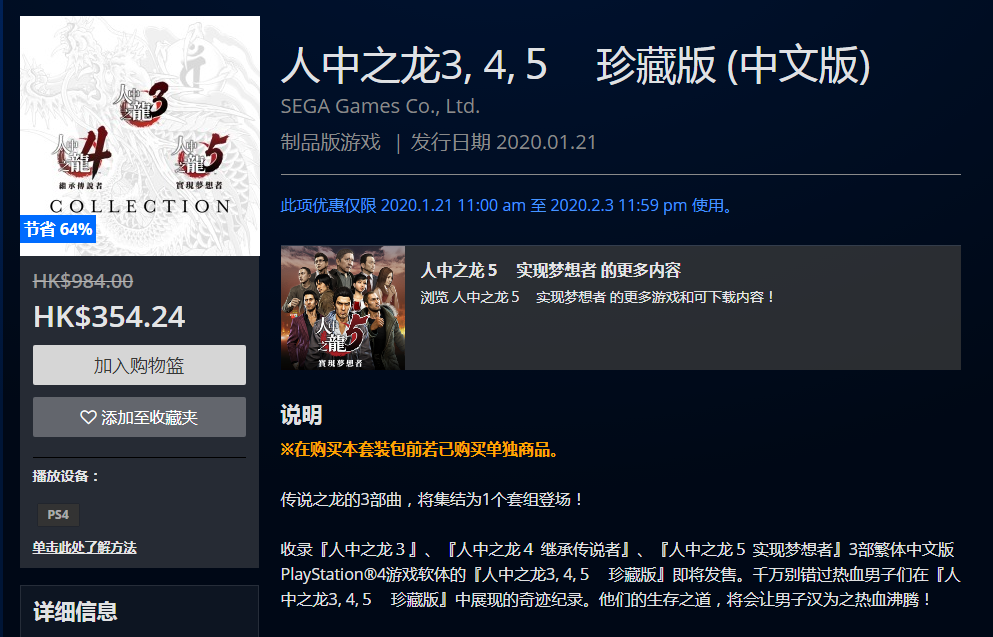 人中之龙3,4,5 珍藏版今日发售984港币,现已优惠三六折,只需354.24港币
