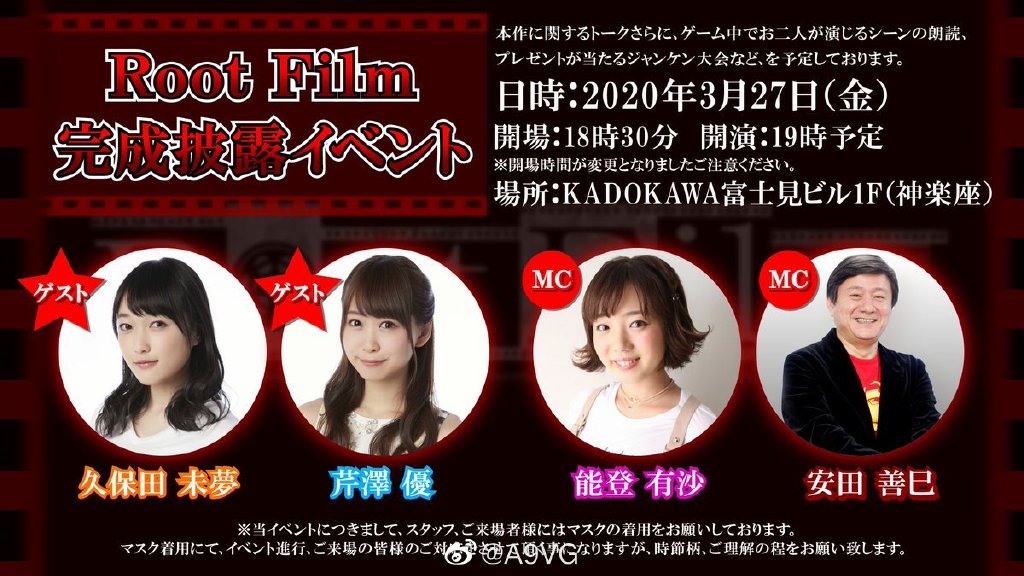 角川游戏将于3月27日举办新作《方根胶卷》的完成披露会。原本预定给到场观众赠送原创纸袋和文件夹。但考虑到观众的健康,角川临时决定将送文件夹换成送口罩,并希望大家都能戴好口罩参加活动。