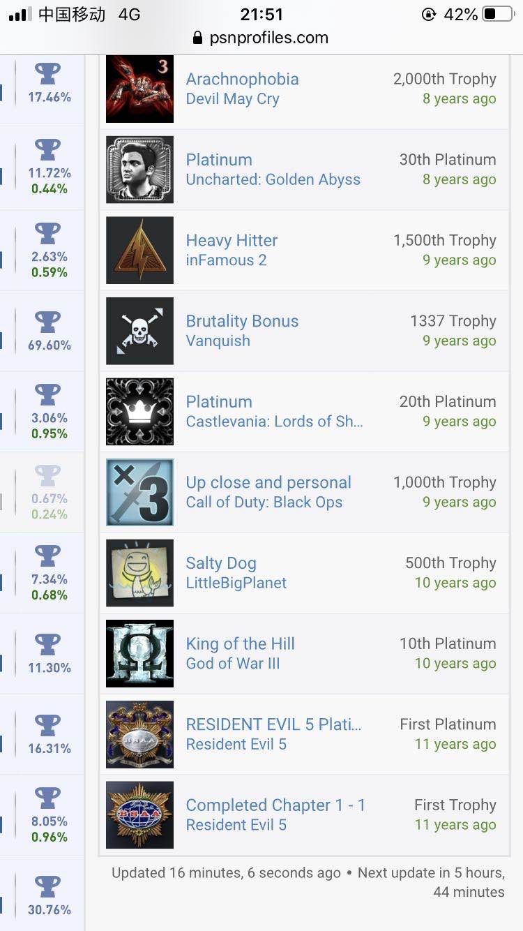 @ms-caroldanvers 是生化5,09年4月11白金的,后来补了dlc奖杯排序跑上面去了。