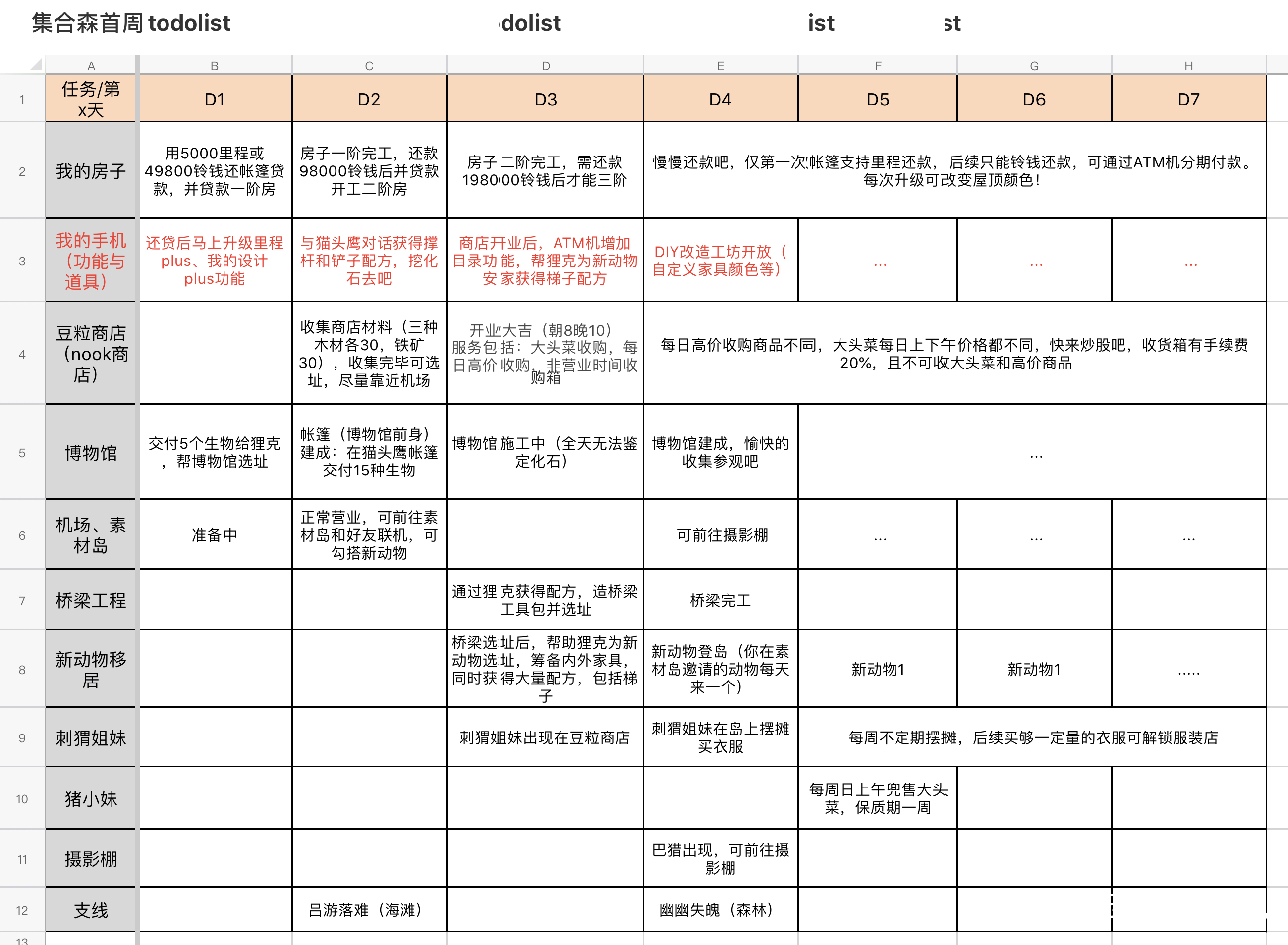 动物之森一周表格,适合刚上岛不知道干嘛的,转载贴吧 时光之笛