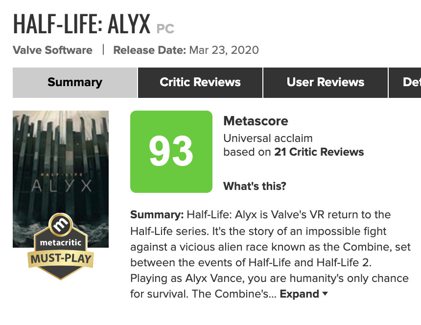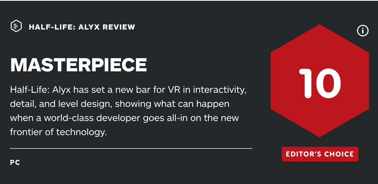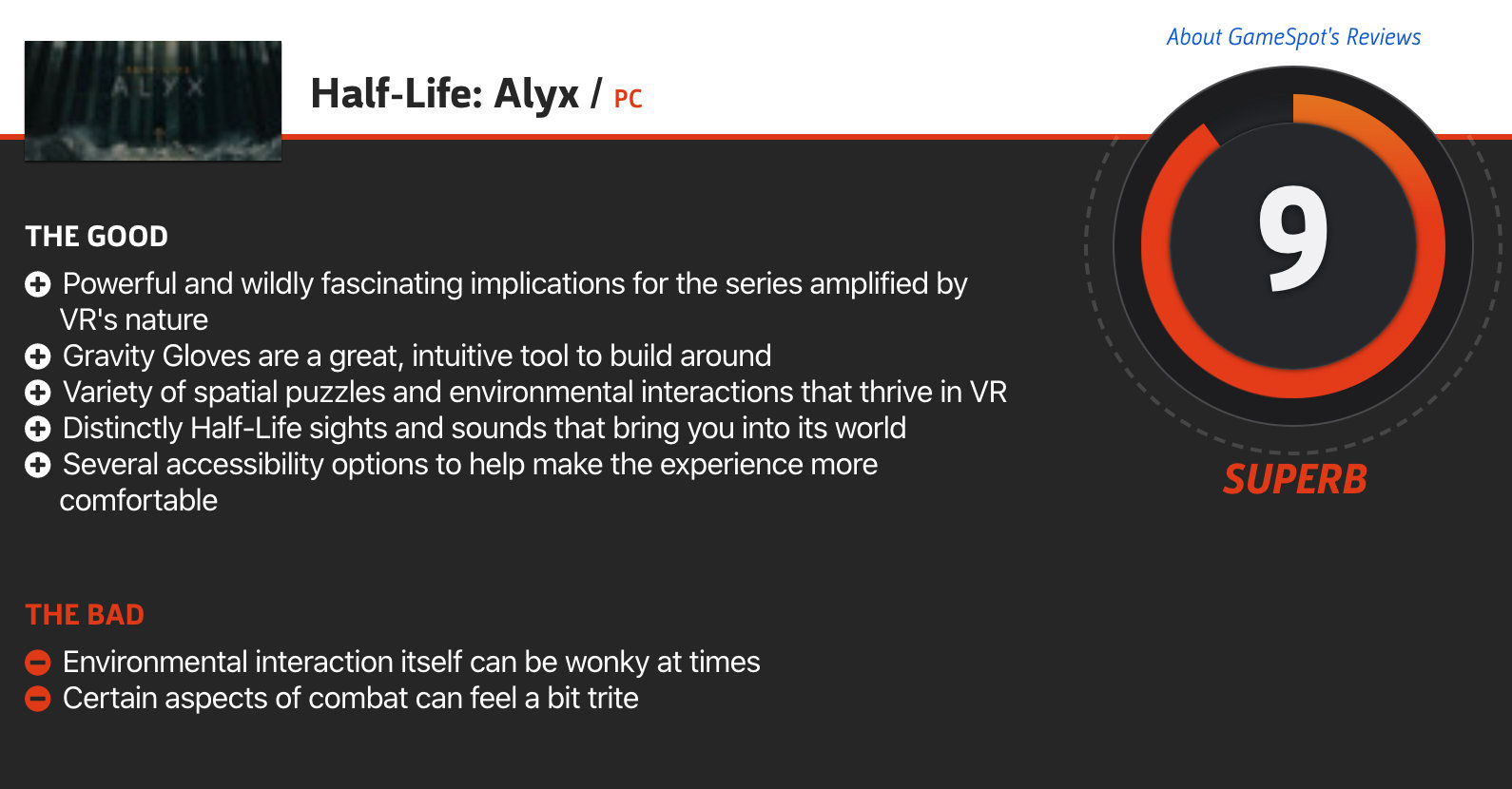 《半条命:爱莉克斯(官译:半衰期:爱莉克斯)》媒体评分解禁,目前的 MC 均分为 93分,IGN 给出 10 分,GameSpot 打出 9 分,Game Informer 给出 9 分。游戏现已在Steam解锁,售价163元,支持中文。