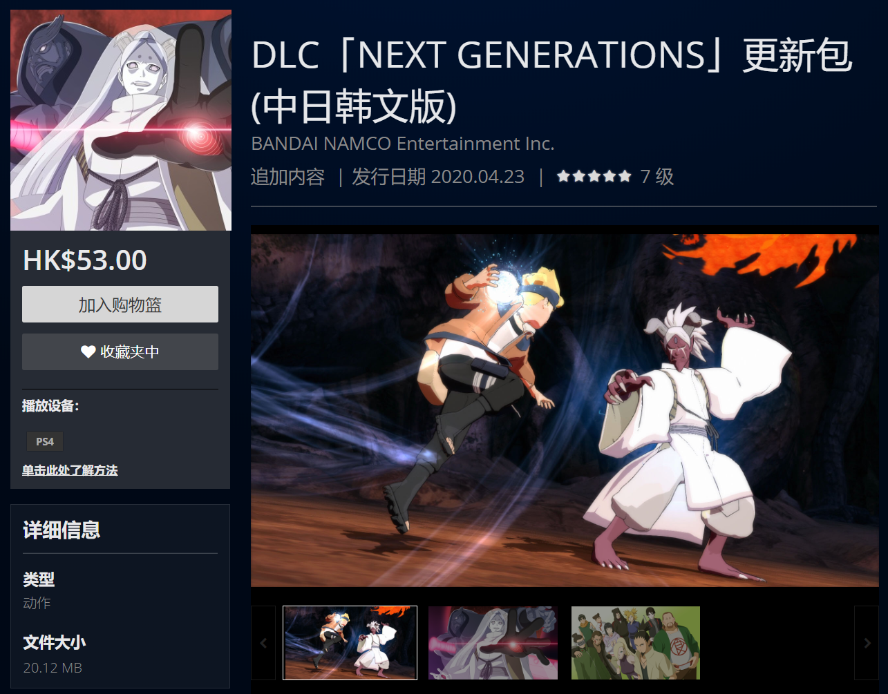 ※要游玩DLC「NEXT GENERATIONS」更新包需拥有PS4®「火影忍者疾风传:终极风暴4」或PS4®「火影忍者疾风传:终极风暴4 慕留人传」任一制品版。另外在需套用最新版更新数据的情况下,请先进行更新后再行使用。