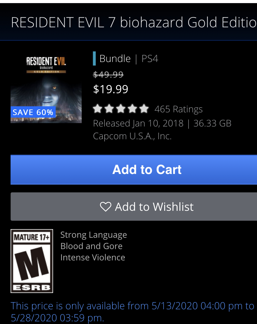 美服生化危机7黄金版限时四折仅20刀