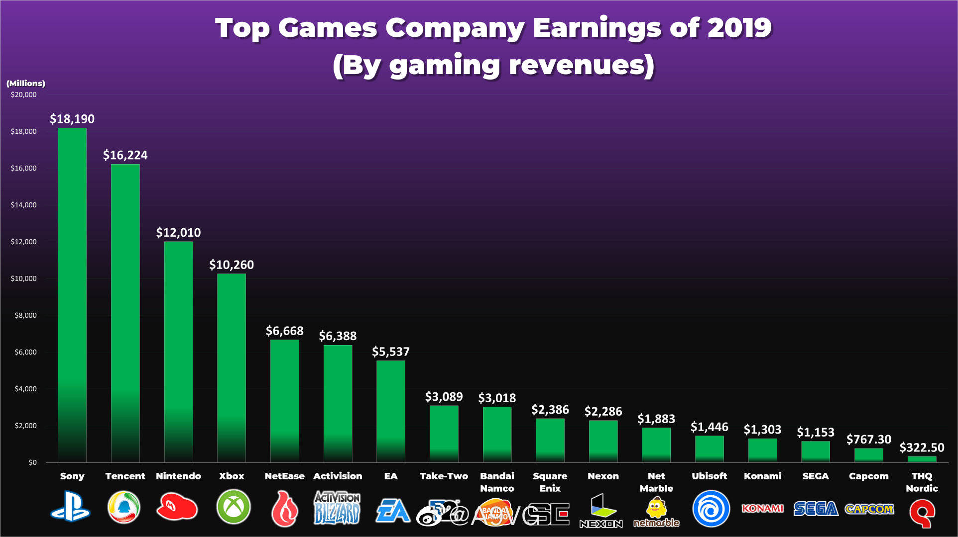 该表显示索尼互动娱乐2019年全年以181亿美元的收益超过腾讯游戏成为了19年收益最高的游戏公司