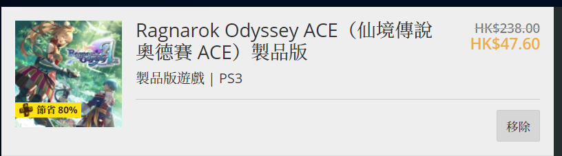 仙境傳說 奧德賽 ACE的PS3版本打折了HK$47.60,应该是最近几年的首次打折了