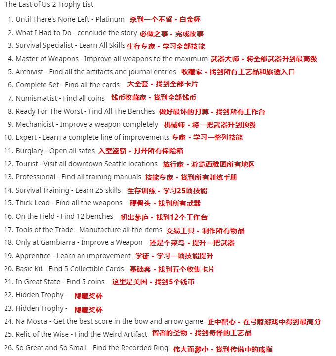 Reddit上泄露的疑似THE LAST OF US PART 2奖杯列表