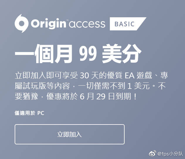 【艺电基础会员首月优惠开启】今天起PC、PS4、Xbox One平台玩家可以首月0.99美金(约8港币)的价格订阅Origin Access或EA Access服务,玩家订阅后可游玩绝大多数已经加入Vault的游戏,并有机会游玩抢先试玩版,或以九折购买艺电游戏、DLC等内容,本次活动持续到6月29日,有兴趣的玩家还请不要错过了~