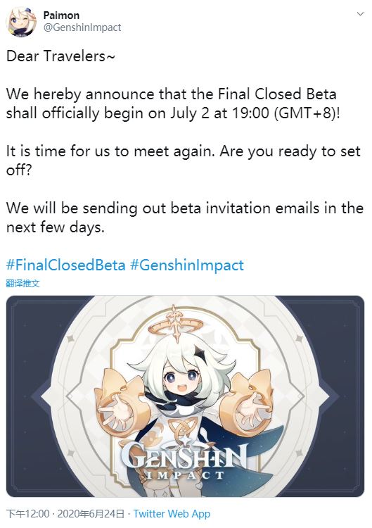 北京时间今天中午,《原神》官方推特宣布:本作的最后一次封闭测试将于北京时间2020年7月2日19:00开启(PS4/PC/iOS/Android),未来几天内会向玩家发送测试邀请邮件。