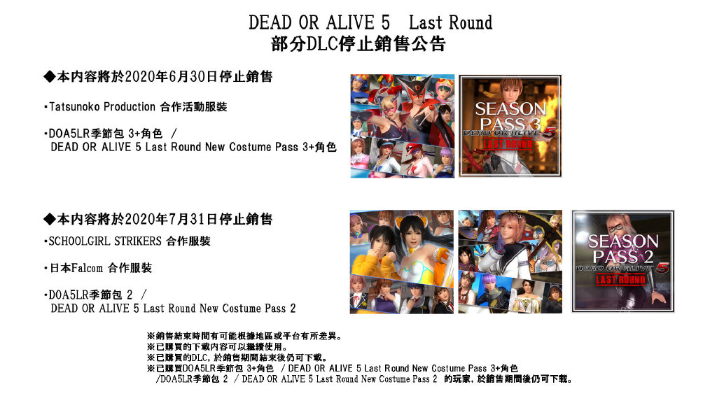光荣特库摩游戏官方微博:感谢各位玩家常年来对《DEAD OR ALIVE 5 Last Round》的支持与爱护,本作品中部分合作服装将停止销售,详情请参考图片。在销售结束前购买的相关DLC今后仍可继续使用,已购买的玩家、想在结束前入手的玩家们请不要担心