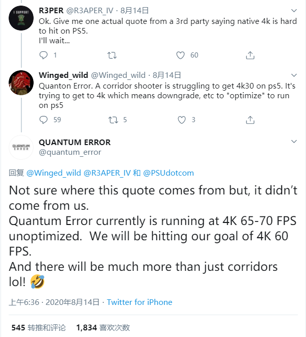 由于这几天“早期游戏在PS5上难以达到原生4K”的流言甚嚣尘上,早已宣布登录PS4、PS5的Cosmic-Horror风格FPS游戏《QUANTUM ERROR》在其官推上回复网友质疑,表示目前未经优化的QUANTUM ERROR可以在PS5上以4K 65-70帧运行,他们将能达到既定的4K 60帧目标。
