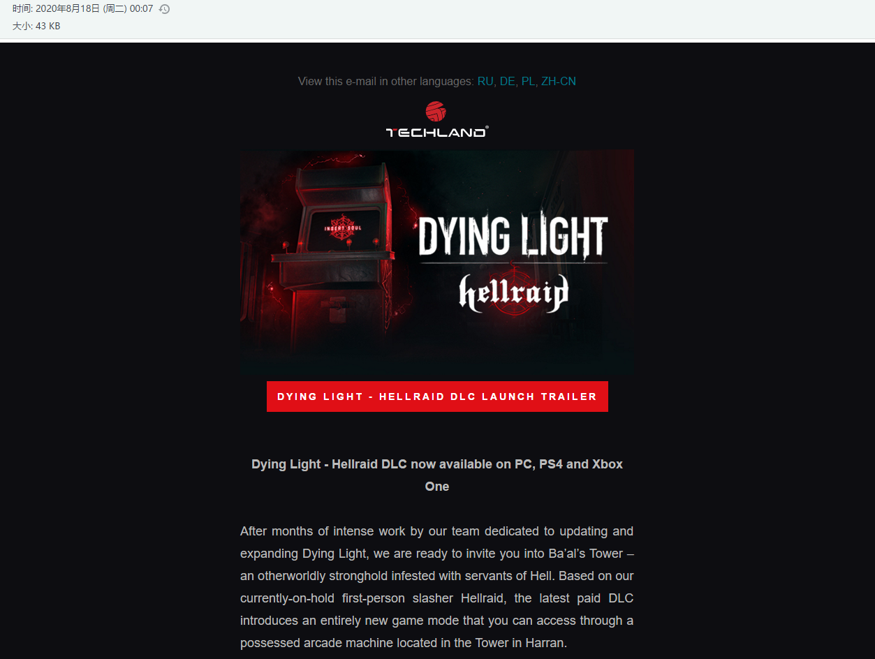 消逝的光芒新DLC-地狱突袭,热乎的邮件,支持2-5人联机。详见出处。