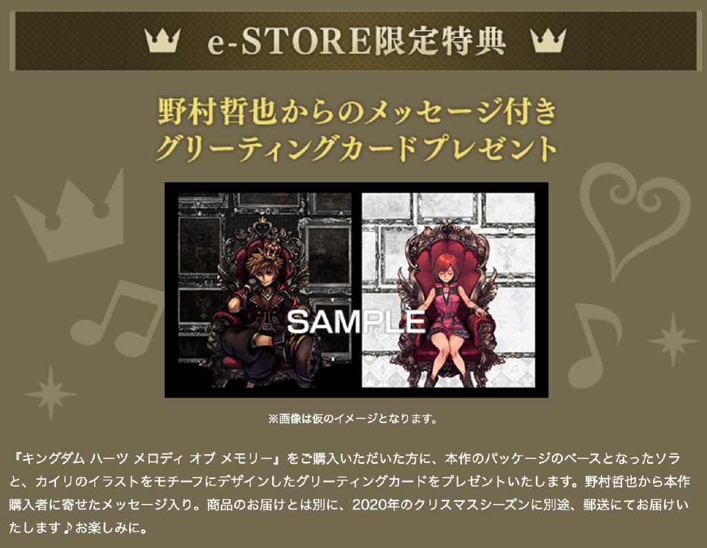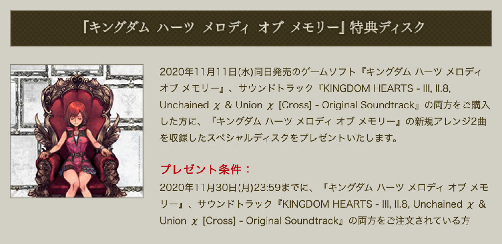 ・SQEX日本线上商店特典2:同时购买游戏与KH3原声音乐集则会赠送特典音乐盘,包含本作的全新编曲2首。