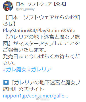 日本一发推宣布,PS4/PSV平台游戏《加雷利亚地下迷宫与魔女的旅团》已开发完成,不会再咕咕了!