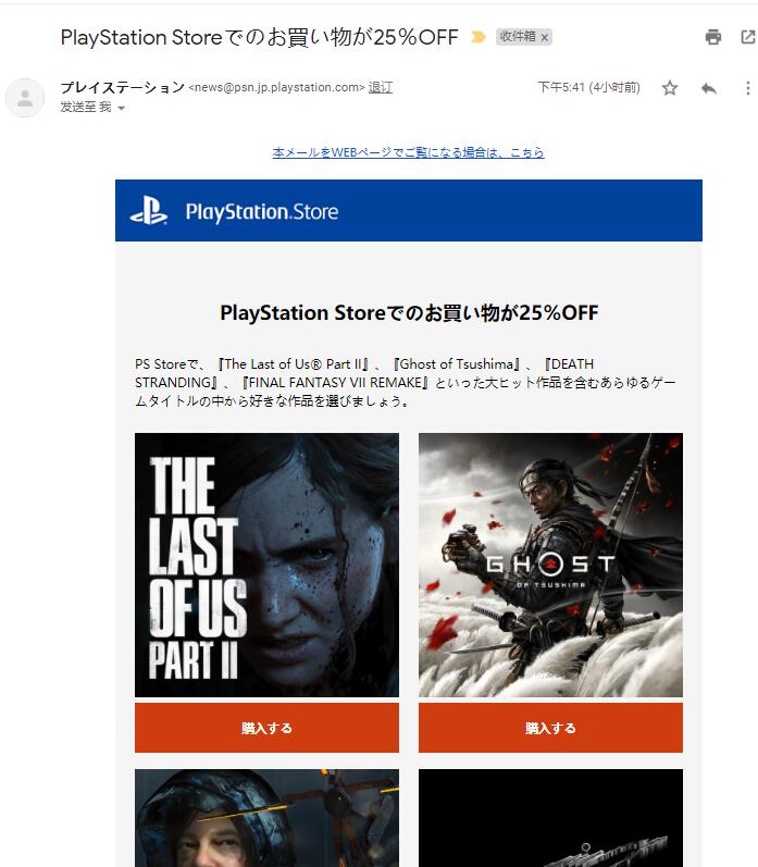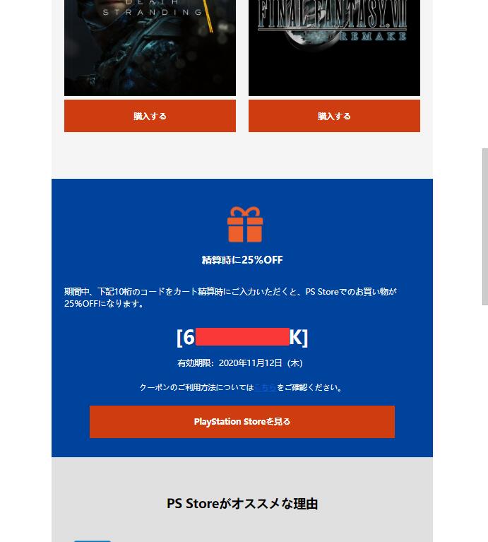 差点直接关掉邮件了,不小心往下一拉突然看到“期間中、下記10桁のコードをカート精算時にご入力いただくと、PS Storeでのお買い物が25%OFFになります。”