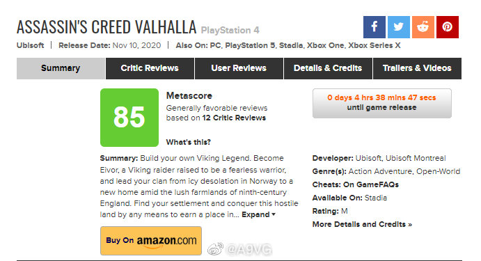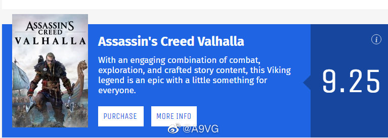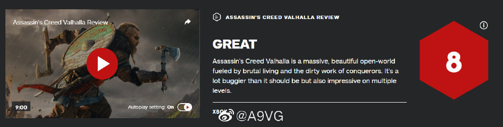 《刺客信条 英灵殿》媒体评分解禁,IGN 8分,Game Spot 8分,GameInformer 9.25。MC均分85,共收录12家媒体。