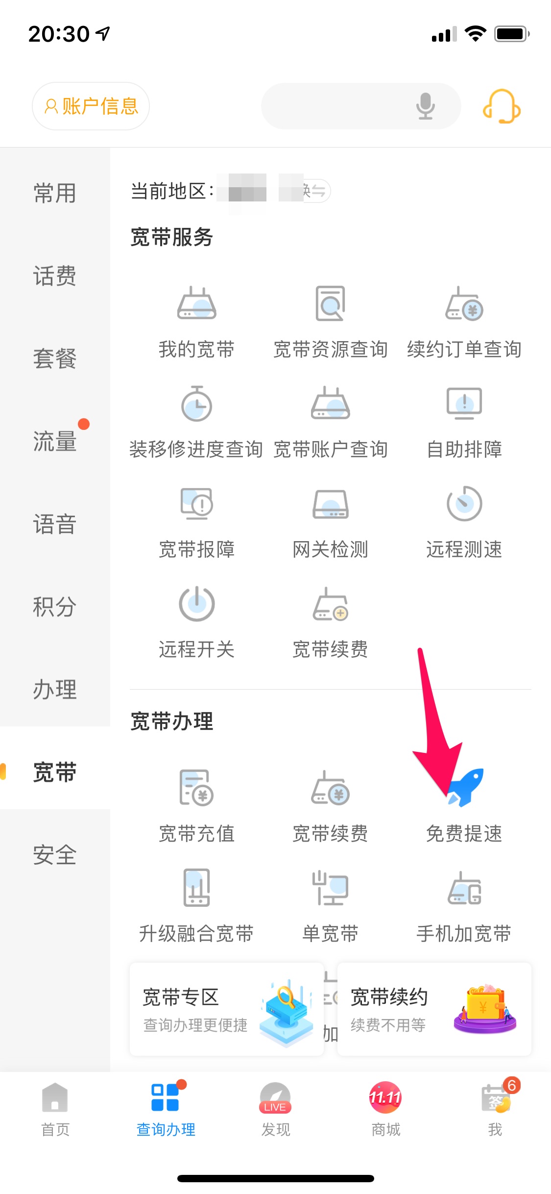 成都区没有看到这个按钮, 不过能搜索免费提速进去, 提示要在家庭wifi下提速,等我回家看看