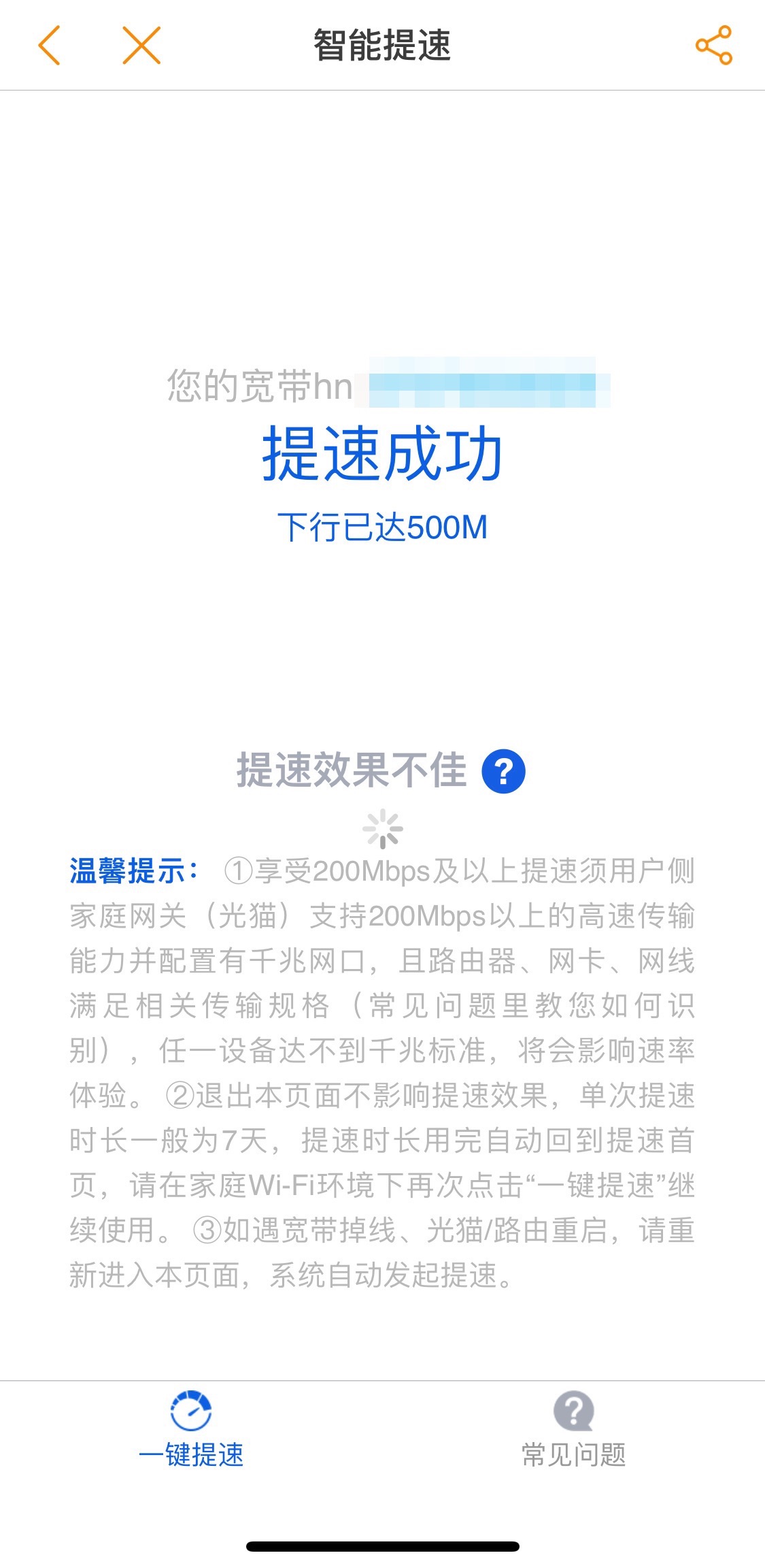 我已经是500/50(每月用10G手机流量,200升500)了,没有免费提速