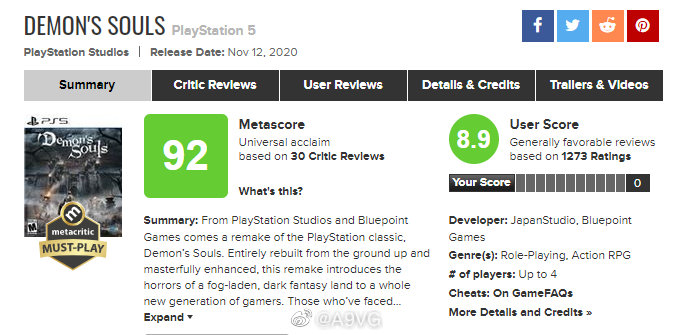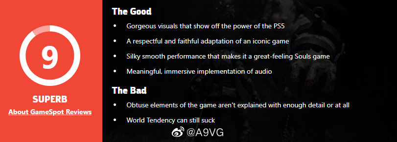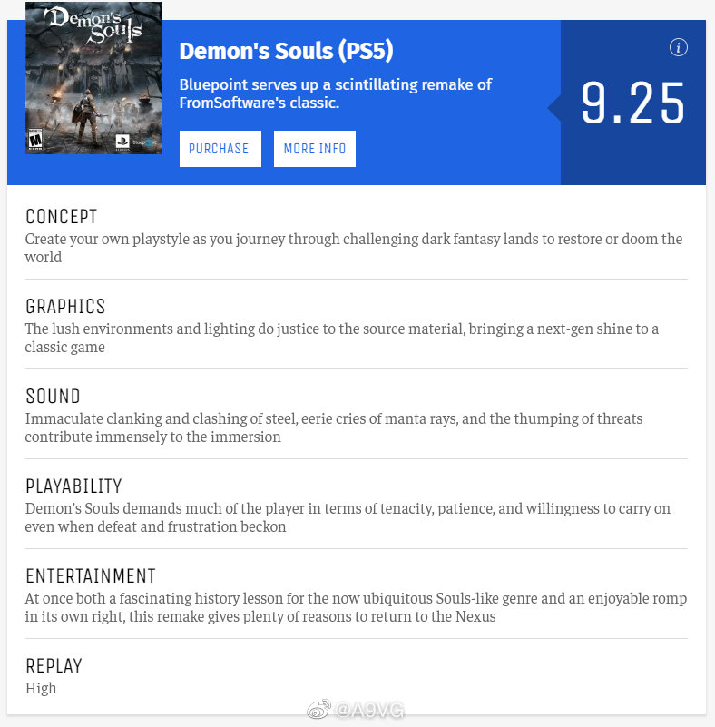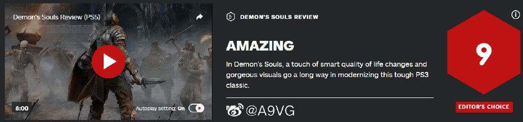 《恶魔之魂 重制版》目前在metacritic的均分为92分,收录30家媒体。IGN 9分,GameSpot 9分,GameInformer 9.25分。IGN的评语如下: