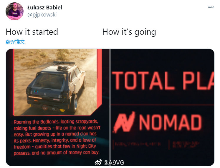 CD Projekt Red QA测试主管Łukasz Babiel在推特上晒出了他近期测试《赛博朋克2077》的记录,图片显示他在这款游戏上投入了近176小时,角色出身选择了“流浪者”。