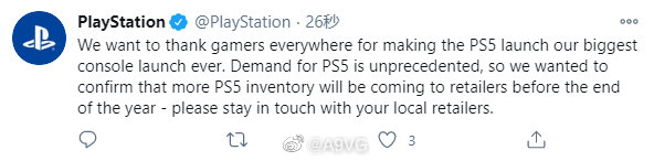 “我们想要感谢世界各地的玩家,是你们让PS5成为了索尼首发销量最高的主机。由于对于PS5的购买热情空前高涨,我们在此确认会在年底之前向零售商补货。请和当地的零售商保持联系。”