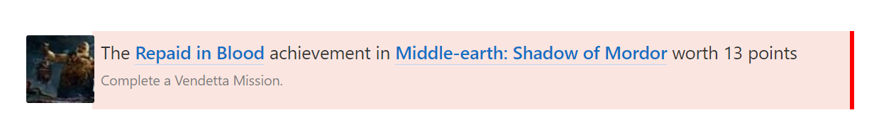 中土世界暗影魔多(仅年度版)可以离线获得本体Repaid in Blood(复仇任务)奖杯(待证实)